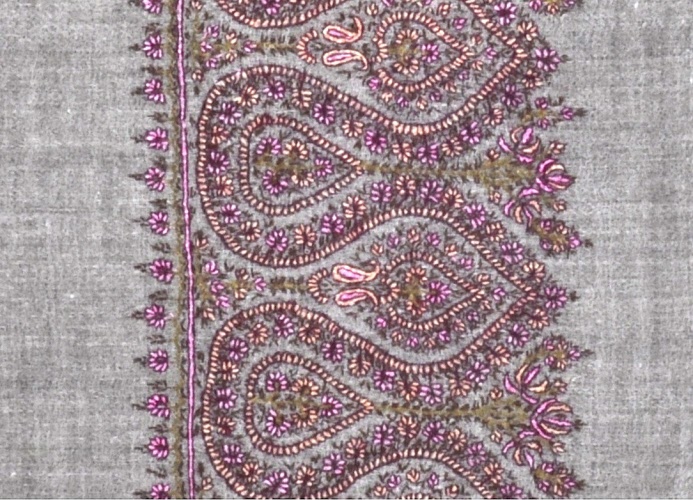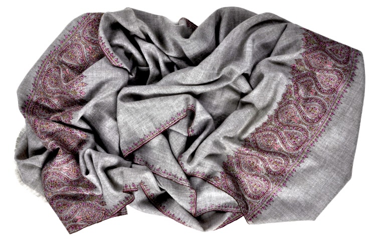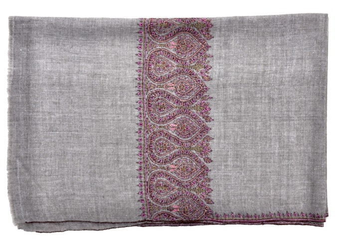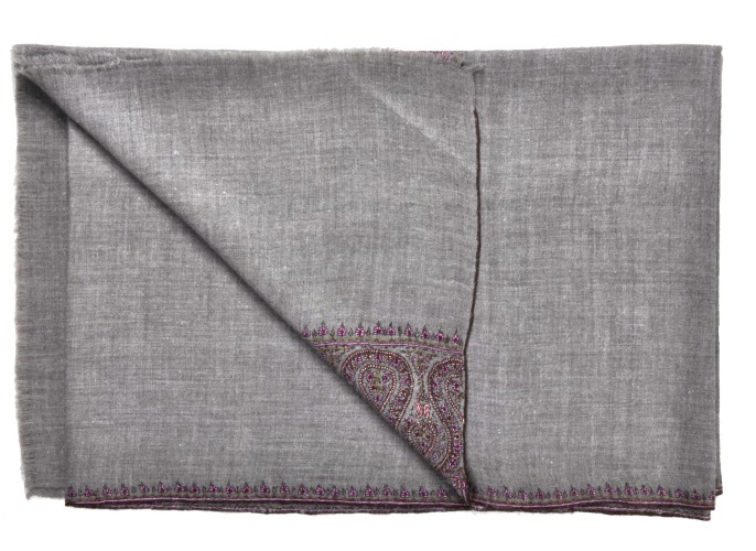 Dette sjal er et 100 % håndlavet produkt. Cashmeren er af den finest og tyndest kvalitet, som er indsamlet med hånd via naturlig fældning og ved at redde gederne, hvilket gør at hårene er længere og dermed blødere end ved almindelig cashmere. Al forarbejdning, spinning og vævning er foregået ved hånd, da det er den eneste måde man kan fremstille så fine, bløde og lette cashmere produkter. Broderingen er exceptionel fint lavet og afslutningerne er så fine, at det praktisk talt er umuligt at se forskel på bag- og forsiden af sjalet.